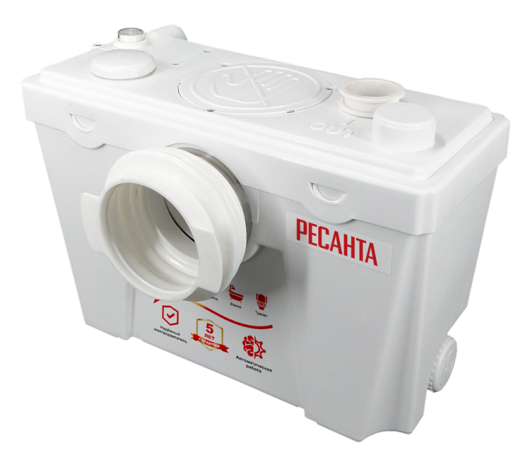 На пластиковом корпусе насоса расположены отверстия для 3-х выходных муфт для отвода воды из умывальника, душа, стиральной машины. В комплекте имеется дополнительная резиновая муфта для подключения к унитазу. Обратный клапан предотвращает попадание жидкости в насосную установку, исключает возникновение неприятного запаха. Автоматический режим работы предусматривает самостоятельный запуск устройства при его наполнении сточными водами. Снижение уровня жидкости до минимального порога приво