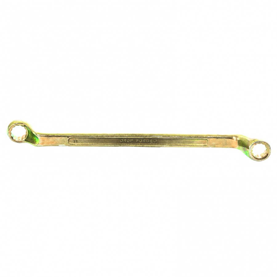 Ключ гаечный коленчатый имеет два кольцевых зева разных размеров.