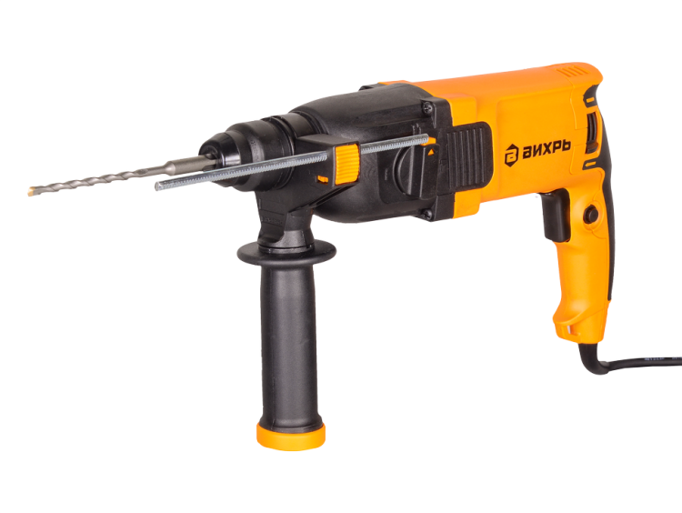 Перфоратор ВИХРЬ – электроинструмент, аналогичный дрели, но с наличием не механического, а пневматического ударного механизма. Именно поэтому перфоратор используют для сложных работ по твёрдым материалам - бетону, кирпичу, металлам. Агрегат используется для сверления и пробивания отверстий в прочных материалах без приложения особых физических усилий со стороны оператора. Принцип работы перфоратора – это разрушение обрабатываемого материала с помощью поступательных и вращательных действий рабочего элемента. Состоит перфоратор из электрического двигателя, редуктора, ударного механизма и патрона для крепления рабочих инструментов (буры, коронки, зубила и т.д.).